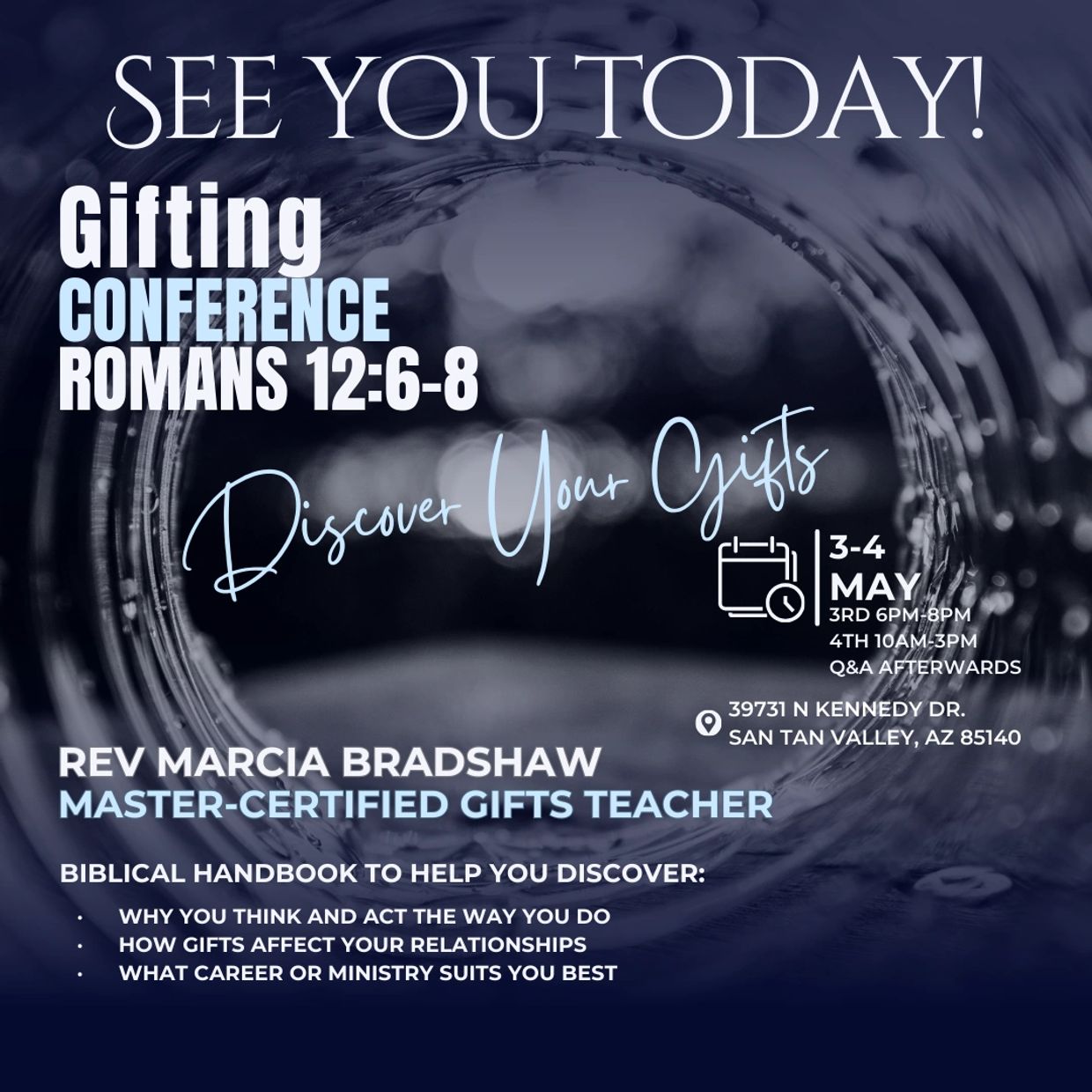 Join us today for the kick-off of the Gifting Conference for the Five-Fold Ministries, led by the incredible Rev. Marcia Bradshaw!